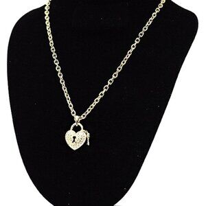 18" Heart & Key Pave Clear Crystal Silvertone Chain Link Charm Keyhole Necklace