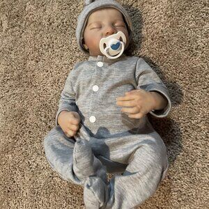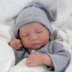 * CLASSICS REBORN BABY DOLL: Shh! Reborn baby boy is sleeping. This little boy is dressed in a soft gray baby outfit, complete with an elf-like baby hat. He seems so sweet and real that you can't help but want to hug him.