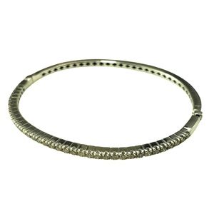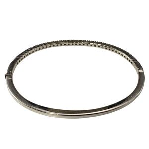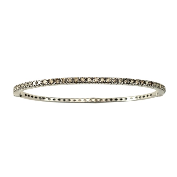 This 18K white gold bangle bracelet is a stunning fusion of elegance and modern luxury, featuring a row of 26 champagne diamonds that add a warm radiant glow. Hinged closure.