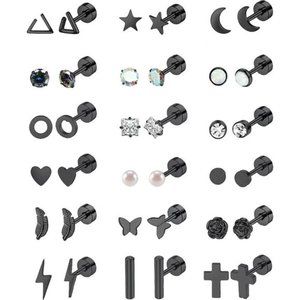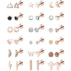 18 Pairs Stud Earrings Set-----You can get 18 pairs stainless steel stud earrings with one order. There are rainbow Cubic Zirconia cartilage stud earrings, opal, triangle, moon, star,butterfly, flower, leaf Geometric screwback earrings, etc. These flatback stud earrings can be used as a work party and play a match to satisfy ladies Heart of beauty.The Most fashion Tiny flat back Earrings Set, Deserve to Purchase.