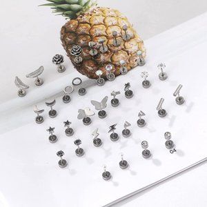 18 Pairs Stud Earrings Set-----You can get 18 pairs stainless steel stud earrings with one order. There are rainbow Cubic Zirconia cartilage stud earrings, opal, triangle, moon, star,butterfly, flower, leaf Geometric screwback earrings, etc. These flatback stud earrings can be used as a work party and play a match to satisfy ladies Heart of beauty.The Most fashion Tiny flat back Earrings Set, Deserve to Purchase.