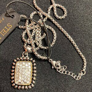18” Silver Toned Box Chain w/ Studs & Stones on Rounded Square Pendant