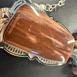 This 18-inch artisan necklace features a bold Picture Jasper pendant framed in beautifully detailed sterling silver, complemented by a strand of coordinating polished jasper beads and silver accents. The warm tones of caramel, taupe, and rose-tan create an earthy yet sophisticated look perfect for any season.