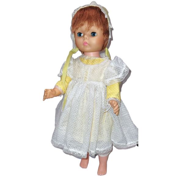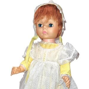This is a beautiful vintage doll with striking ginger red hair and deep blue sleep eyes. This doll is approximately 18 inches tall, perfect for a littles girls play doll.