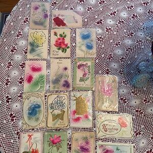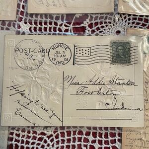 All in plastic sleeves/ some stamped and post marked/ all are embossed / dates from 1908-1912/ last 2 pics are of the one thicker card and deeper embossed- made in Germany/ 18 total