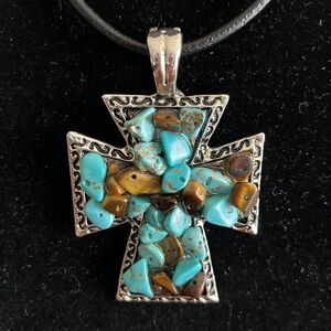 Bohemian Silver-Tone Cross Pendant Turquoise Brown Bead Leather Cord Necklace