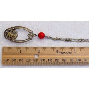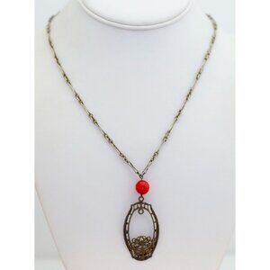 18 inch, Vintage Silver Tone Avant Garde Basket with Red Bead Necklace - L1