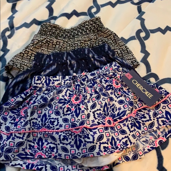 (1) skirt with bloomers attached from Cherokee. (1) black and white patterned shorts. (1) blue patterned shorts from carters
