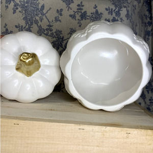White pumpkin-shaped flower arrangement vessel from 1-800-Flowers, featuring a gold stem and embossed flowers on the sides.