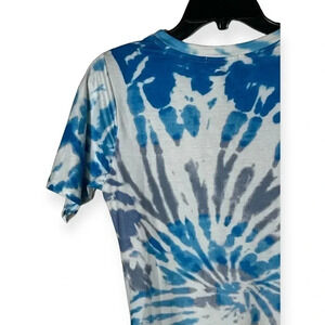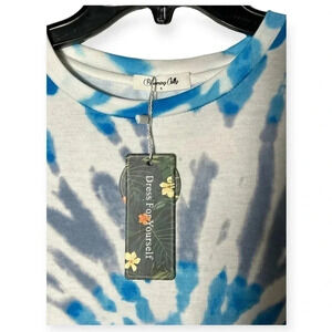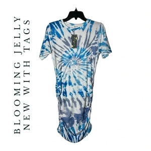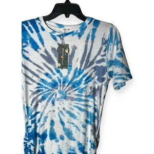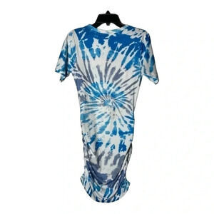 DETAILS: TIE DYE; TSHIRT DRESS STYLE; RUCHING DOWN BOTH SIDES; SHORT SLEEVES; ROUND NECKLINE; MIDI LENGTH; NEW WITH TAGS; LIGHTWEIGHT