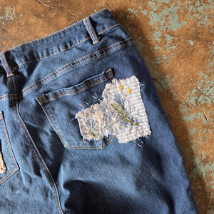 1822 Denim cuffed stretch jeans which have been embroidered and reworked with patches, stitching, and a granny square. Size 20W. Lots of stretch! Super unique and special upcycled jeans! Jeans are hand embellished and will require gentle washing and care.