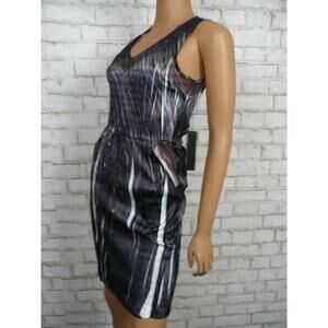 $184 Komarov Black Multi Vneck Mesh Insert Drawstring Sheath Dress Medium NWT
