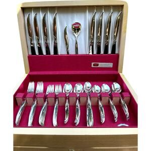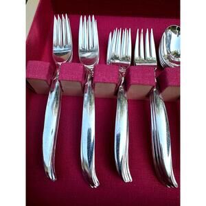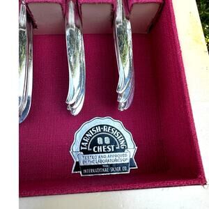 Add a touch of vintage elegance to your dining experience with this exquisite 1847 Rogers Bros. 'Flair' silverplate flatware set! This comprehensive 67-piece set provides 7-piece place settings with service for eight, making it perfect for family dinners, holiday gatherings, or special occasions. The set also includes a set of 11 Serving Pieces and a rare, stunning, retro MCM tarnish resistant blonde wooden storage chest. The 'Flair' pattern is known for its timeless design and delicate detailing, adding a touch of sophistication to any table setting. This midcentury set is in very good to excellent vintage condition and includes: