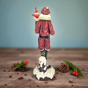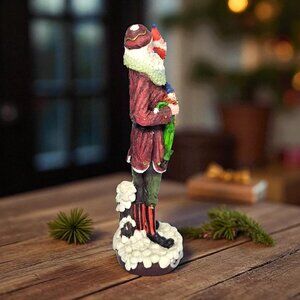 Pencil Santa stands in the snow holding dolls from his workshop. Part of teh "American Santas Through the Decades" collection by Roman Inc.