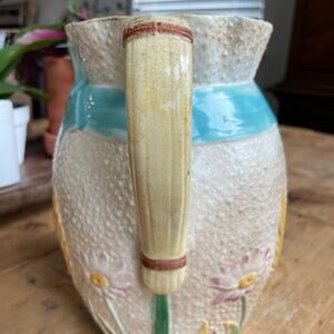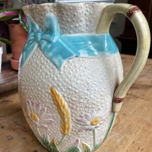 This is an 1880s English majolica art pottery pitcher. The diamond is the English registry diamond that was used on items in the mid to late 1800s. This English pitcher is textured with a blue ribbon and bow and daisy pattern.