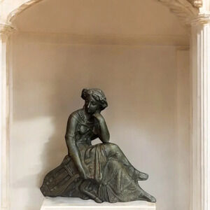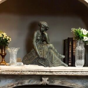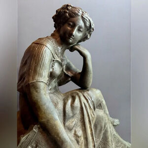A Victorian period sculpture of a woman with a harp or lyre in the art nouveau style that was probably salvaged from an Ansonia Pompeii 1881 mantel clock.