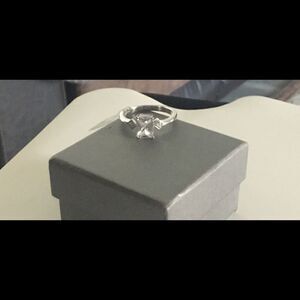 This engagement/bridal ring is gorgeous! Everyone will think you spent thousands on this beauty. A center 1.5 carat emerald cut AAA quality Diamonelle simulated diamond gemstone is flanked on each side by a small round .10 carat stone. The band and setting is done with 3 full grams of .925 solid sterling silver and is stamped for authenticity. It has then been layered in platinum. We have one in size 7 and one in size 8.