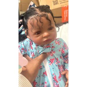 * Realistic Baby Doll : She dresses exclusively designed outfit with sweet expression, owning bright brown eyes, mottled black skin, lifelike veins and tiny manicured fingers and toes. And she has micro rooted black blended curly human synthetic hair with adorable headbands and delicate eyelashes, which look incredibly real. You can comb or do a style for her hair gently