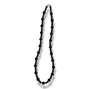 This elegant vintage necklace features a timeless design of glossy black glass beads. Measuring 18 inches in length, the necklace offers a classic and versatile look suitable for both formal occasions and everyday wear. The beads are arranged in a graduated pattern, with smaller beads interspersed to enhance the overall aesthetic.