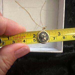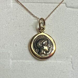 18K Ancient Coin Replica Necklace with 16" 14K Chain - New in box with certified appraisal. (box has marker on it. If you need a generic box, please let us know and we will be happy to provide one. See our photos for details and measurements. Price is FIRM.