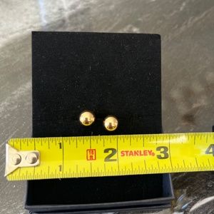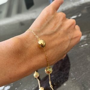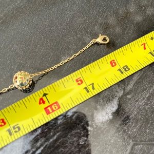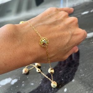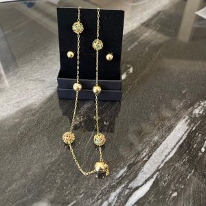 This gorgeous 18K Brazilian Gold plated set features a very unique 18” necklace with interchanging gold and mesh-like balls. The mesh-like balls are filled with blue, pink and green crystals to add some subtle color. Each of the 7 balls on the necklace measure approximately 1/2”. The matching ball stud earrings are approximately 1/4”. Both are super light to ensure comfortable wear. Never been worn. So unique and perfectly giftable! Get this set at a wonderful price.