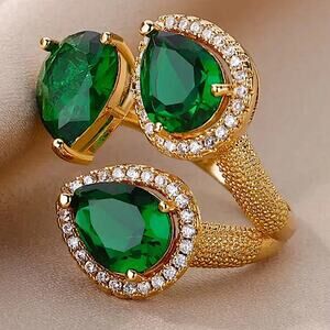 18K GOLD PLATED EMERALD LEAF RING ZIRCON ACCENTS ADJUSTABLE SIZE