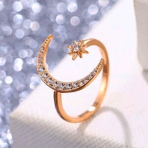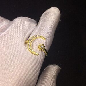Exquisite 18K Gold Plated Sterling Silver Cresent Moon and Star Diamond Ring Encased with Diamonds