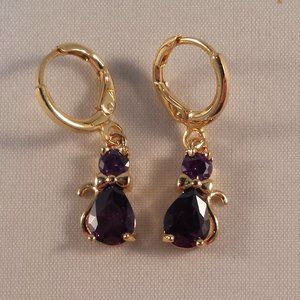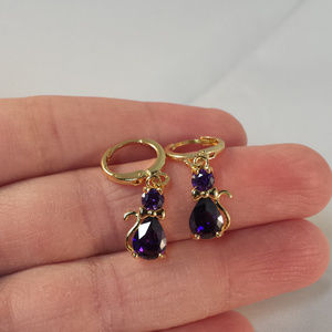 Beautifully crafted classic zircon cat design dangle earrings 18K yellow gold filled. High sparkle luster round +pear purple simulated diamond topaz zircon gemstones. Top quality, brand new, never been worn. Lead, nickel free.