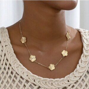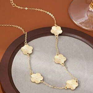 This refined necklace features five clover motifs crafted in 18K gold filled finish, each with a softly textured surface that catches the light beautifully