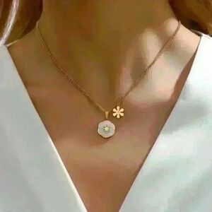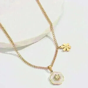 Charming 18K gold filled necklace featuring two flower pendants — one with white enamel detail and one in polished gold. Adjustable length (15.7" + 2" extender)