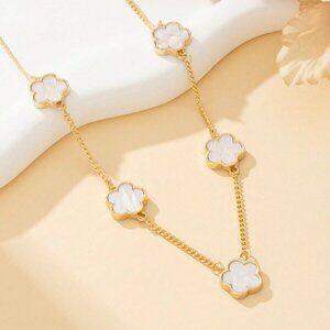 Elegant 18K gold filled necklace featuring five dainty mother-of-pearl clover flower charms. Adjustable length (14.6" + 2.7").
