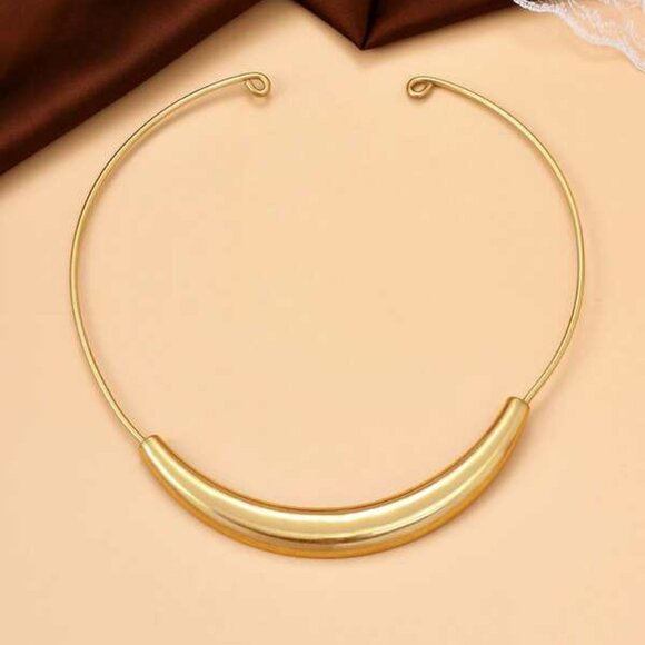 Elegant sculptural collar necklace featuring a smooth crescent-shaped centerpiece with a sleek, modern curve. Crafted with 18K gold filled finish over a durable alloy base, this minimalist design sits beautifully along the neckline for a refined statement look.
