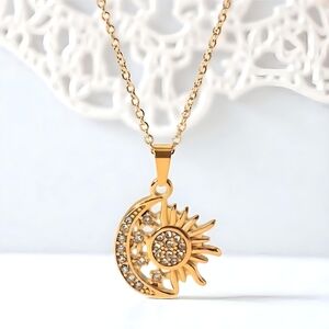 moon necklace • sun pendant • gold plated jewelry • celestial necklace • zodiac gift • star and moon jewelry • everyday layering necklace • dainty gold necklace • boho chic accessory • cosmic fashion • minimalist gold jewelry • sparkly zirconia pendant • hypoallergenic necklace • romantic gift idea • festival jewelry • bridal accessory • gift for her • astrology inspired necklace • trendy celestial pendant • water‑resistant jewelry • celestial