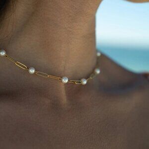 18K Gold Paperclip Chain & Pearl Necklace, PVD Coated, Water & Tarnish Resistant