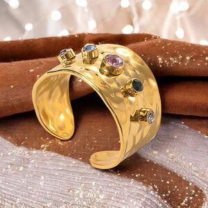 Looking for a statement piece that blends bold elegance with modern charm? This 18K gold plated stainless steel open adjustable ring is a must-have! Featuring a stunning hammered texture and adorned with sparkling cubic zirconia in vibrant colors, this piece is perfect for those who love eye-catching jewelry.