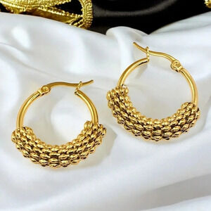 18K gold plated hoop earrings, beaded hoop earrings, stainless steel earrings, hypoallergenic earrings, gold hoop earrings, trendy earrings, women's earrings, 1.2 inch hoop earrings, gift-ready earrings, luxury earrings, fashion jewelry, gold plated jewelry, premium packaging, jewelry gift box, durable earrings, lightweight earrings, classic hoop earrings, beaded texture earrings, statement earrings, everyday wear earrings, elegant hoop earrings, unique hoop earrings, stylish earrings, gold fashion accessories, hypoallergenic gold earrings, earrings for sensitive ears, perfect gift for her, gold hoops for women