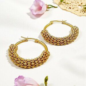 18K gold plated hoop earrings, beaded hoop earrings, stainless steel earrings, hypoallergenic earrings, gold hoop earrings, trendy earrings, women's earrings, 1.2 inch hoop earrings, gift-ready earrings, luxury earrings, fashion jewelry, gold plated jewelry, premium packaging, jewelry gift box, durable earrings, lightweight earrings, classic hoop earrings, beaded texture earrings, statement earrings, everyday wear earrings, elegant hoop earrings, unique hoop earrings, stylish earrings, gold fashion accessories, hypoallergenic gold earrings, earrings for sensitive ears, perfect gift for her, gold hoops for women