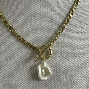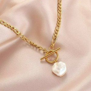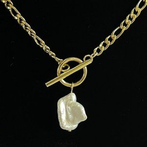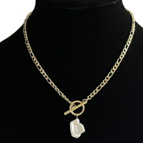 18K Gold Plated Stainless Steel Chain Link Baroque Freshwater Pearl Pendant Necklace 17.5 in