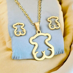 Add a touch of charm to your collection with this adorable 316L 18K gold plated stainless steel bear necklace and earrings set! 🐻✨ Perfect for daily wear or as a thoughtful gift, this set features a beautifully crafted bear pendant on a delicate chain, paired with matching stud earrings. Made from high-quality stainless steel, this set is not only stylish but also durable and hypoallergenic. Ideal for bear lovers and those who adore cute, minimalist jewelry. Get ready to shine with this trendy set that’s perfect for any occasion! 🌟