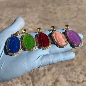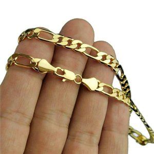 La Virgen De Guadalupe Chain 20". Virgen de Guadalupe /Holy Mary 20" necklace. Figaro link chain is 18k gold plated over brass. Figaro chain has a secure lobster claw clasp. Gold plated 316L stainless steel Mary pendant.