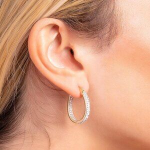 These stunning hoop earrings are a perfect way to add a touch of elegance to any outfit. Featuring sparkling cubic zirconia set inside and outside the hoops for a dazzling shine, they catch the light beautifully. Crafted with high-quality 18K gold plating, they have a luxurious, long-lasting finish that stays shiny and vibrant. Designed for everyday wear, they're lightweight and comfortable, making them great for dressing up or adding a bit of sparkle casually. Made in Brazil with great attention to detail, these earrings are lead-free and nickel-free, so they’re gentle on the skin.