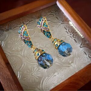 Elevate your style with these stunning 18K gold plated multicolor rhinestone and crystal dangle earrings. The beautiful earrings are perfect for any occasion and are sure to make a statement. The AB Blue crystal and multicolor rhinestone add a touch of glamour to the overall design, making them a must-have for any fashion-forward individual.