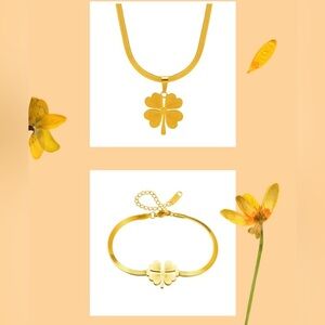 18K Gold Plated Necklace & Bracelet in Set, Four-Clover Leaf Stainless Steel-NEW
