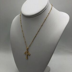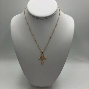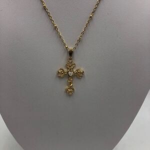 18K Gold Plated Ornate Cross Women's Necklace Hypoallergenic Waterproof Religious Has What looks like flowers (rose buds) at the ends)