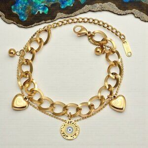 🆕️18K Gold Plated Stainless Steel Double Chain Bracelet Heart Evil Eye Charm 🌟