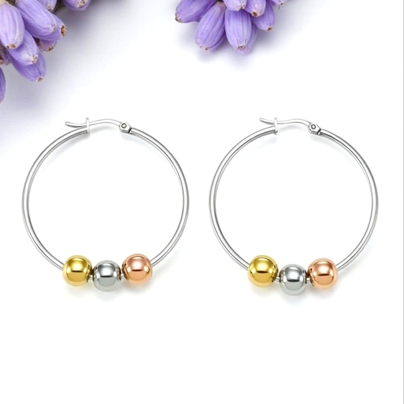 ποΈβ 18K Gold Plated Stainless Steel Tri-Color Beaded Hoop Earrings Trendy Chic