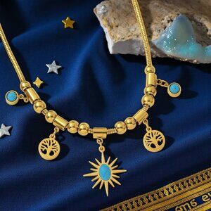Let your inner light shine with this radiant necklace! Crafted from 18K gold plated stainless steel, this piece features vibrant genuine turquoise inlays and symbolic charms including two Trees of Life and a central sunburst pendant. The golden beads and smooth snake chain add an extra touch of glam. Whether you're drawn to its meaning or just love its boho-chic beauty, this necklace is a captivating accessory you'll reach for again and again.