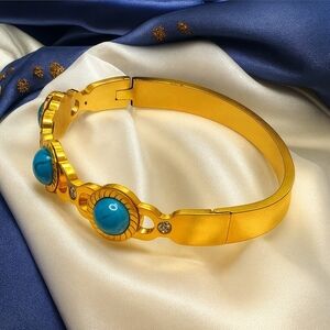 18K gold plated bangle, turquoise bracelet, stainless steel jewelry, gold cuff bracelet, natural turquoise stone, polished turquoise, turquoise gemstone, zirconia crystal bracelet, hinged bangle, tarnish-resistant jewelry, hypoallergenic bracelet, adjustable bangle, elegant bracelet, statement jewelry, trendy bracelet, womenβs fashion jewelry, gift for her, boho chic bracelet, luxurious jewelry, stylish wristwear, stacking bracelet, minimalist jewelry, durable gold bracelet, blue stone bracelet, gold fashion accessories, unique gift idea, everyday jewelry, premium