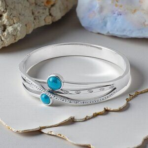 Make a statement with this stunning 18K white gold plated 316L stainless steel bangle bracelet, featuring two natural polished turquoise stones that add a pop of color and elegance! πΏπ The design includes delicate engraved details, a touch of sparkling zirconia, and a secure clasp for a comfortable fit.