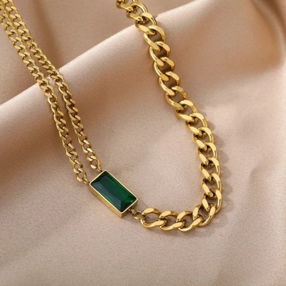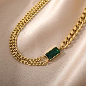 18K Gold Plated Vintage Emerald Asymmetric Cuban Necklace